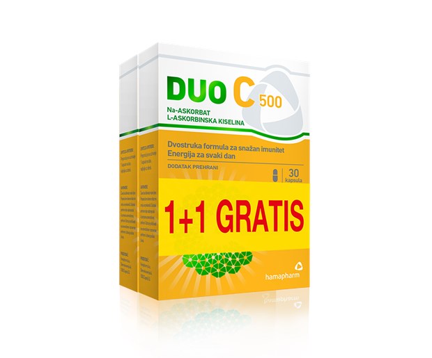 Duo C 500 kapsule dvostruka su formula Vitamina C 500 mg s produljenim oslobađanjem. Vitamin C dolazi u obliku Na askorbat i L-askorbinska kiseline. Natrij askorbat neutralnog je ph i blag prema sluznici želuca. Pravi je izbor vitamina C za osobe s gastrintestinalnim smetnjama kao gastritis, bolovi u želucu, dijareja i sl. Vitamin C doprinosi normalnom metabolizmu stvaranja energije i normalnoj funkciji imunološkog sustava, doprinosi smanjenju umora i iscrpljenosti, povećava apsorpciju željeza te doprinosi normalnom stvaranju kolagena.